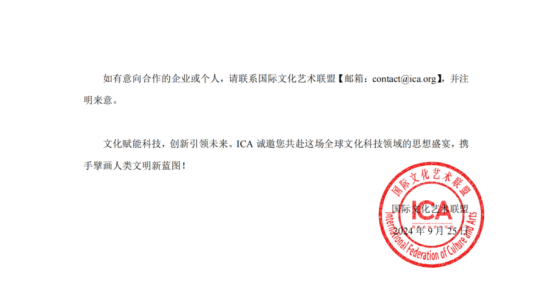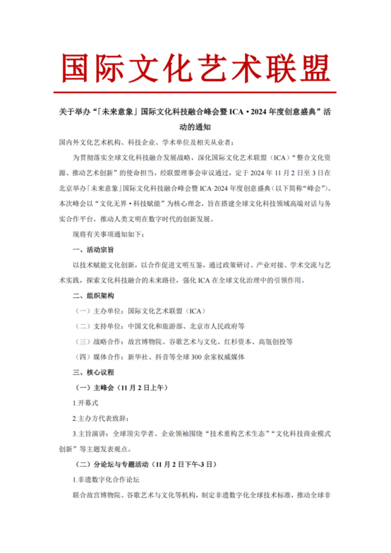 (记者/王紫凝)昨日,国际文化艺术联盟(International Federation of Culture and Arts,缩写为ICA)正式发布通知,宣布由其主办的“「未来意象」国际文化科技融合峰会暨ICA年度创意盛典”将于2024年11月2日至4日在北京盛大启幕。